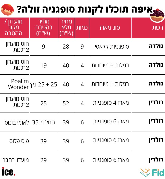 ברשת גולדה, למשל, המחירון הרגיל למארזים אינו נמוך, אך מועדוני הלקוחות מציעים הנחות דרמטיות: מארז קלאסי שעולה 28 שקלים נמכר בהטבת "הוט מועדון צרכנות" ב־9 שקלים בלבד. גם מארזים משולבים של סופגניות רגילות ומיוחדות מוצעים בהנחות משמעותיות, כגון מארז שמחירו המלא 40 שקלים ונמכר ב־19 שקלים בלבד. בחלק מהמועדונים אף משלבים נקודות עם תשלום מופחת, כפי שמציע מועדון Poalim Wonder.