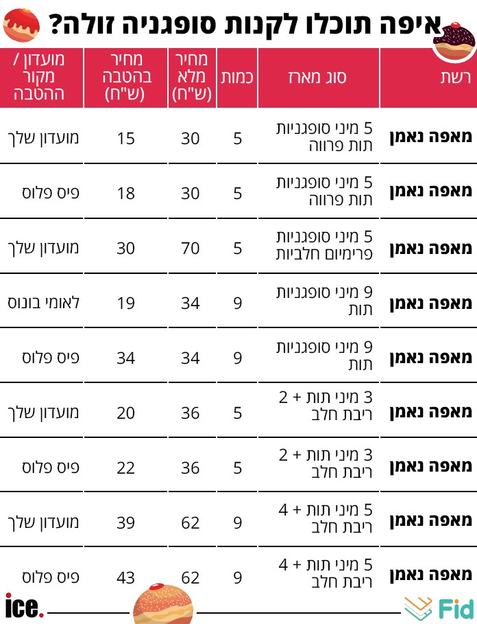 בעיצומו של חג החנוכה, כשהביקוש למתוקים מזנק והמחירים ברשתות הקונדיטוריות נוסקים בהתאם, לכן בדקנו באמצעות אפליקציית FID איפה ניתן לרכוש סופגניות בזול. מהבדיקה עלה כי מי שמוכן להשוות מחירים ולנצל את ההטבות של מועדוני הלקוחות יכול לחסוך עשרות שקלים בכל רכישה ולעיתים אף לשלם שליש בלבד מהמחיר המקורי. ההבדלים בין רשת לרשת ומועדון למועדון גדולים במיוחד השנה, ומייצרים הזדמנות ממשית לקנות סופגניות במחירים זולים בהרבה מהמחירון הבסיסי.