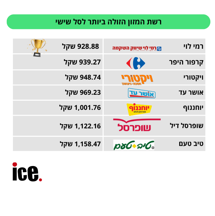 התוצאה הייתה חד־משמעית: רשת רמי לוי הציגה את הסל הזול ביותר, במחיר כולל של 928.88 שקלים. מנגד, טיב טעם הייתה הרשת היקרה ביותר בבדיקה, עם סל שעלותו הגיעה ל־1,158.47 שקל פער של כמעט 230 שקל על אותם מוצרים בדיוק.
