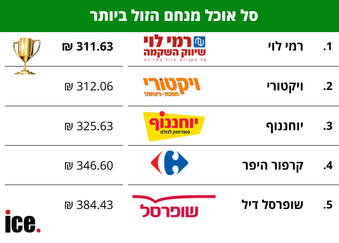 כזכור, בבדיקה אותה ערכנו אתמול בהשלמת הקניות, הרשת המוזלת לרכישה זו יצאה רשת רמי לוי. הממצאים הנוכחים, מראים על פער משמעותי בין הרשתות השונות. הסל הזול ביותר נמצא ברשת רמי לוי, ועולה 311.63 שקל, בעוד הסל היקר ביותר נמצא ברשת שופרסל דיל, ועולה 384.43 שקל.