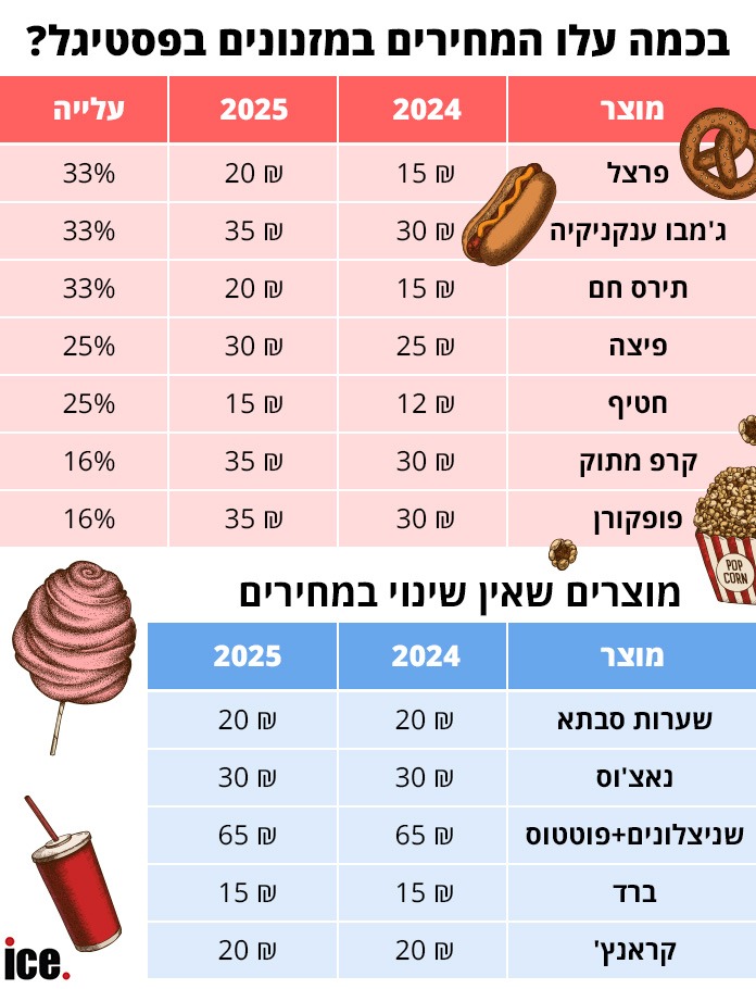 מבדיקה שערכנו והשוואה בין מחירי המזנונים של הפסטיגל בשנת 2024 לעומת שנת 2025 עולה תמונה ברורה: לא מעט פריטי מזון התייקרו ב־33%, חלק מהמוצרים רשמו עלייה של כ־20% ואחרים עלו בכ־16%. עם זאת, ישנם גם מוצרים ששמרו על אותו מחיר משנה שעברה, אבל השורה התחתונה היא שעלות המזנון גבוהה מאוד גם כאשר אין עליה כך שמדובר במגמה כללית של יקרות והחמרה בהוצאה. מדובר במזנון בלבד, ללא השירות שמסעדה מספקת מקום ישיבה, ניקיון ושרות מלא שמצדיקים בדרך כלל מחירים גבוהים יותר במסעדות ובכל זאת התעריפים דומים ואף לעיתים גבוהים יותר ביחס לשירות שהמשתמש מקבל.
