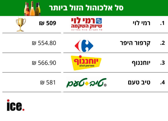 בשוק האלכוהול ברשתות המזון ניכרת בשנים האחרונות תחרות גוברת במיוחד, כאשר הצרכנים מחפשים את השילוב הטוב ביותר בין איכות למחיר. בשנה האחרונה ניתן לראות כי גם בתחום האלכוהול נפתחת התחרות, לאור הצרכים ההולכים וגדלים של משפחות רבות שרוכשות משקאות לארוחות, לאירועים וחגים, כאשר הרשתות מציעות מבצעים והטבות שונות במטרה למשוך לקוחות. כדי להבין איפה הסל האלכוהולי משתלם ביותר, בדקנו והשווינו את מחירי סל מזון הכולל מוצרים אלכוהוליים במספר רשתות מובילות באמצעות אתר פרייסז. כזכור, בבדיקה אותה פרסמנו הבוקר בסל פירות וירקות, יצאה רשת רמי לוי עם סל המזון הזול ביותר.