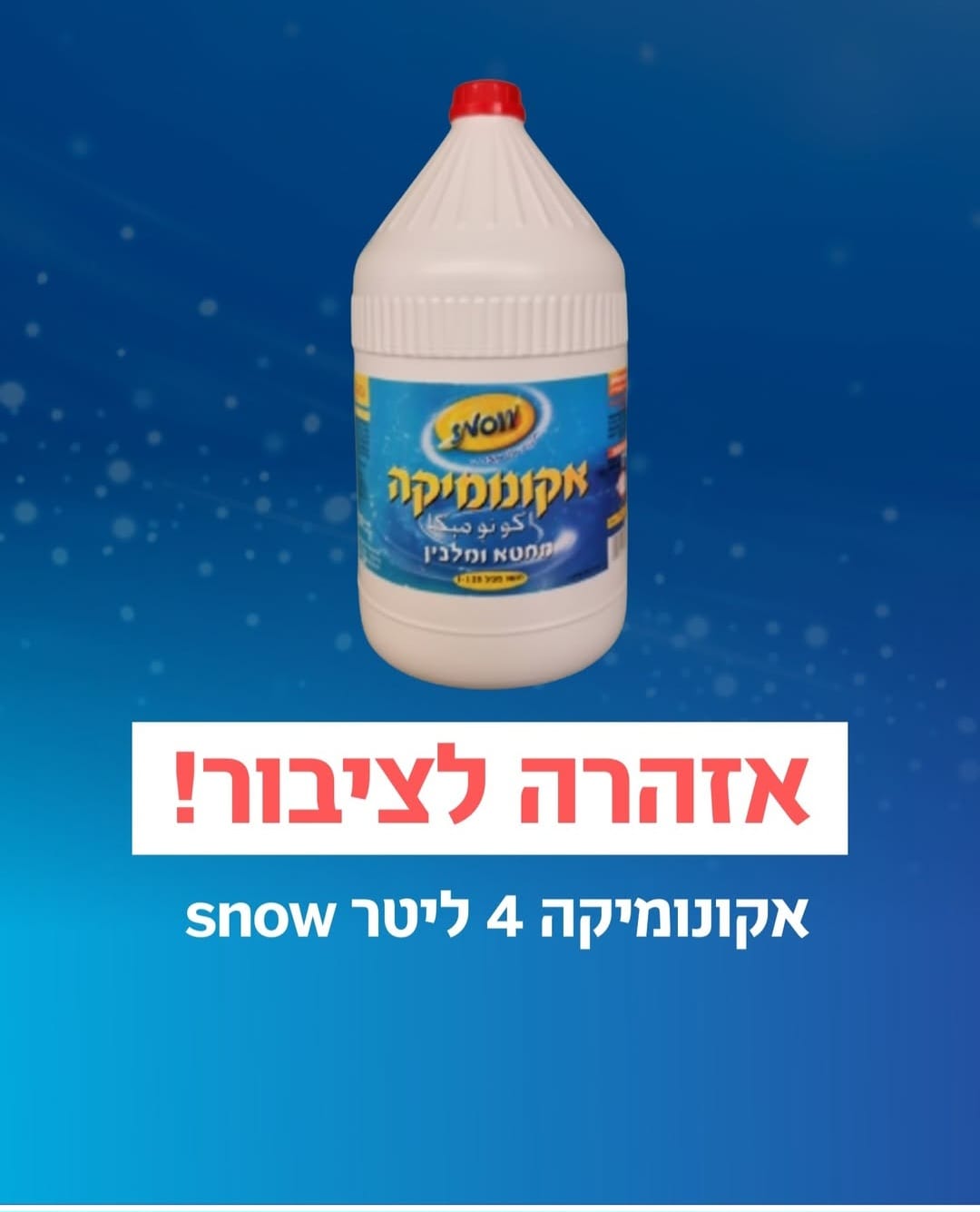 כל בית בימנו משתמש באקונומיקה לניקיון. לכן, משרד הכלכלה והתעשייה הממונה על התקינה במשרד הכלכלה מזהיר את הציבור ומבקש להפסיק מיידית את השימוש במוצר אקונומיקה 4 ליטר Snow של חברת יהלום תעשיית חומרי ניקוי בע"מ.