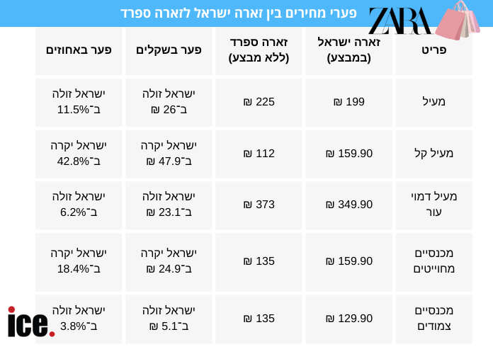 מנגד, ישנם פריטים שבהם התמונה הפוכה לחלוטין. מעיל קל שנמכר בישראל במבצע ב־159.90 שקל, עולה בזארה ספרד 112 שקל בלבד – פער של כמעט 48 שקל, כלומר כ־42.8% יותר בישראל, למרות המבצע. גם מכנסיים מחויטות ישרות עם חגורה עולות בישראל 159.90 שקל במבצע, בעוד שבספרד מחירן 135 שקל ללא הנחה, פער של כ־18.4% לרעת הצרכן הישראלי.