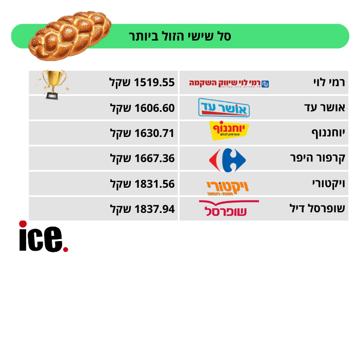 ארוחת שישי מושקעת מכילה מרכיבים יקרים. לכן, כדאי לשים לב כמה זה יכול לעלות. המצרכים להכנת ארוחת בת כמה מנות עם סלים גדולים יכולה להגיד למאות שקלים ויותרת לכן, בדקנו והשווינו באמצעות אתר פרייסז את עלות סל המזון המלא לארוחת שישי בכמה מרשתות המזון המרכזיות, כדי לגלות מי מציעה את המחיר הזול ביותר ומי את היקר ביותר. כזכור, בבדיקה אשר ביצענו אתמול בה בדקנו איפה סל ההיגיינה האישית הזול ביותר נמצא, מצאנו כי התוצאה מראה ברשת רמי לוי.