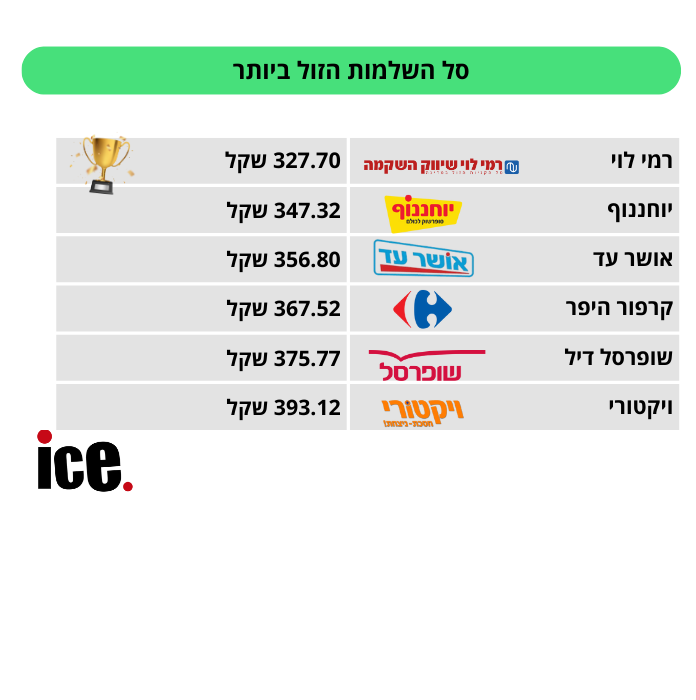 בבדיקה שביצענו באמצעות אתר פרייסז נבחן סל השלמות שבועי של מוצרים בסיסיים, שחסרים בדרך כלל באמצע השבוע. הסל הזול ביותר נמצא ברשת רמי לוי והסתכם ב־327.70 שקל, לעומת הסל היקר ביותר שנמצא ברשת ויקטורי ועמד על 393.12 שקל. מדובר בפער של 65.42 שקל בין שתי הרשתות עבור אותו סל מוצרים בדיוק.