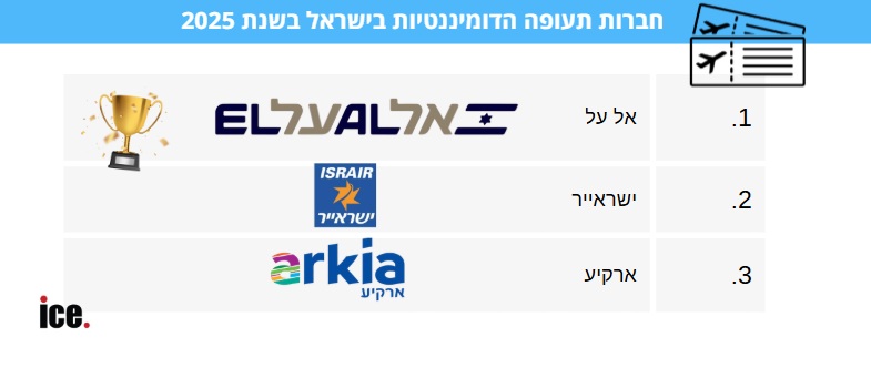 במקביל, חברות התעופה הישראליות שומרות על דומיננטיות ברורה בשמיים. אל על מובילה את היקף הפעילות עם כ־38% מנתח השוק בנתב״ג, אחריה ישראייר וארקיע. שלוש החברות יחד אחראיות לכ־58% מכלל תנועת הנוסעים בנמל, כאשר במקום הרביעי מדורגת וויז אייר ההונגרית המובילה מבין החברות הזרות.