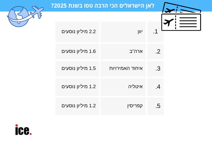 היעדים המבוקשים ביותר בקרב הנוסעים בשנת 2025 ממשיכים לשקף את מרכזיותה של ישראל בצירי התעופה הבינלאומיים. יוון הובילה עם כ־2.2 מיליון נוסעים, אחריה ארצות הברית עם כ־1.6 מיליון, איחוד האמירויות עם כ־1.5 מיליון, ולאחר מכן איטליה וקפריסין – כל אחת עם כ־1.2 מיליון נוסעים.