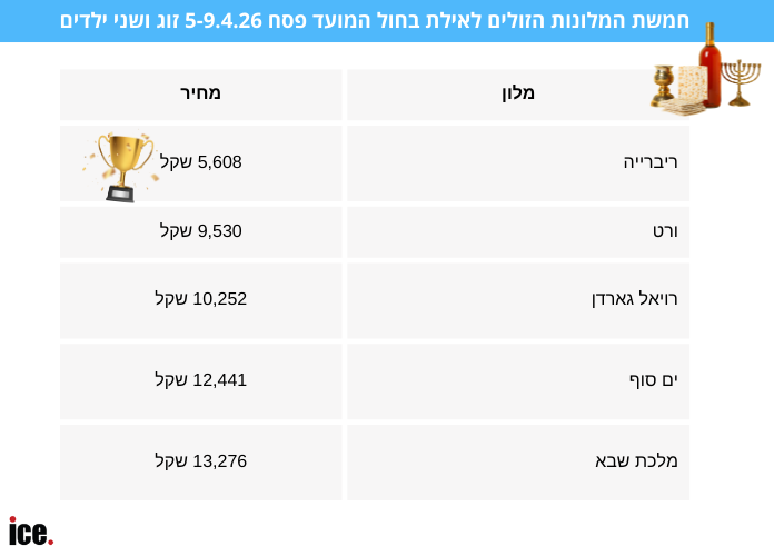 מדובר בהוצאה משמעותית במיוחד לחמישה ימים בלבד, אך היא אופיינית לתקופה בה כל החדרים המבוקשים מתמלאים במהירות. לדוגמא, מלון רייבירה מרשת ישרוטל מתחיל מ‑5,608 שקל עבור המשפחה כולה, בעוד שמלון מלכת שבא, שנחשב יוקרתי במיוחד, עולה 13,273 שקל. ההפרש בין המלון הזול ביותר ליוקרתי ביותר עומד על 7,665 שקל, או כ‑136% יותר.