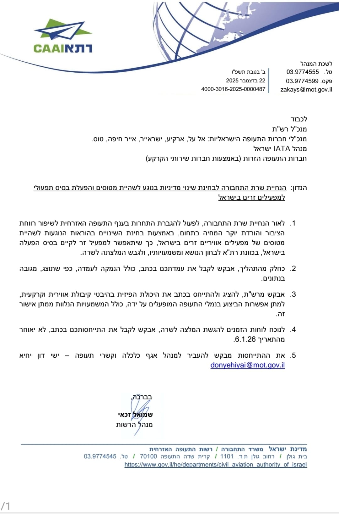 המכתב שנשלח למנכ"לים של חברות התעופה הישראליות
