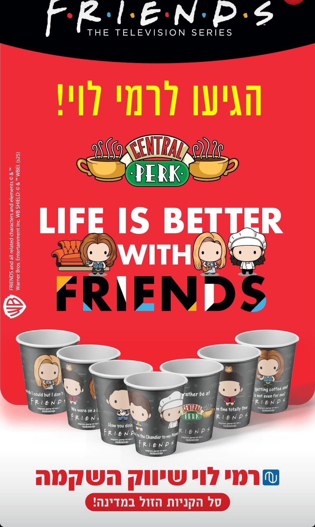 אך מקדונלד’ס והפופ־אפ אינם היחידים שרוכבים על גל ה“חברים”. גם רשת רמי לוי שיווק השקמה מצטרפת לטרנד שסוחף את כולנו בימים אלה, ומשיקה ברשת כוסות חד־פעמיות מעוצבות עם הדמויות האהובות מהסדרה. המהלך משתלב בגל הנוסטלגיה העולמי סביב “חברים”, ומביא את הקסם של הסדרה גם לשולחן הביתי, בקניות היומיומיות וברגעים הקטנים של שגרה.