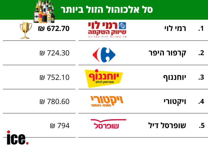 לצורך הבדיקה ביצענו השוואת מחירים באמצעות אתר פרייסז, ובחנו סל אלכוהול זהה ברשתות השיווק הגדולות. מהבדיקה עולה כי הרשת הזולה ביותר היא רמי לוי, עם סל בעלות של 672.70 שקל. מנגד, הסל היקר ביותר נמצא ברשת שופרסל דיל, שם המחיר מגיע ל־794 שקל.