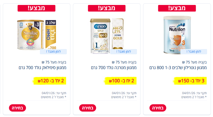 ברכישה של 3 יחידות ממגוון נוטריליון שלבים 1-3 (800 גרם), תשלמו 150 שקלים, זאת כאשר המחיר המקורי לאריזה הינו 64.90 שקלים. בנוסף, בקנייה של 2 יחידות ממגוון מטרנה גולד (700 גרם) תשלמו 100 שקלים בלבד, זאת כאשר העלות המקורית ליחידה מסתכמת ב-74.90 שקלים. בעת קנייה של 2 יחידות ממגוון סימיליאק (700 גרם), תשלמו 120 שקלים, כאשר על יחידה אחת בלבד תשלמו 69.90 שקלים.