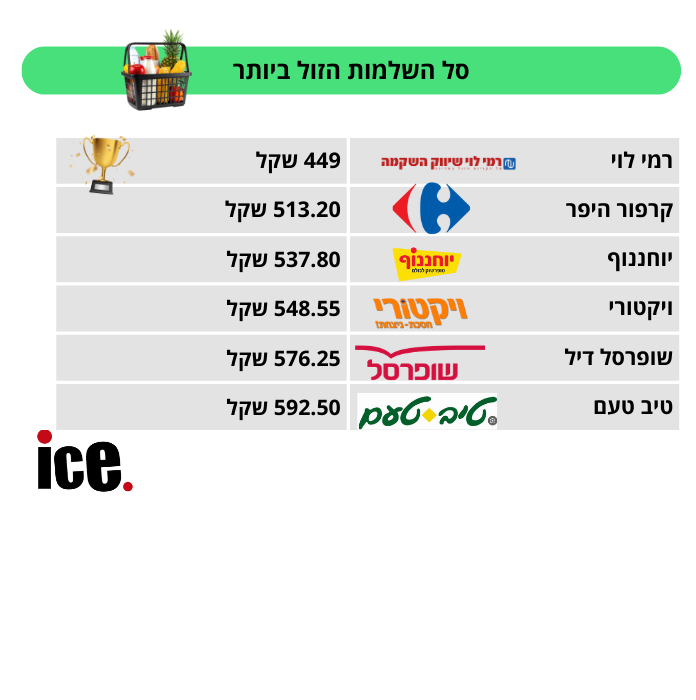 לצורך הבדיקה נערכה השוואת מחירים באמצעות אתר פרייסז, שבחן סל השלמות שבועי זהה ברשתות השיווק הגדולות. מהבדיקה עולה כי הסל הזול ביותר נמצא ברשת רמי לוי, עם עלות כוללת של 449 שקל, בעוד הסל היקר ביותר נמצא ברשת טיב טעם, עם מחיר של 592.50 שקל.