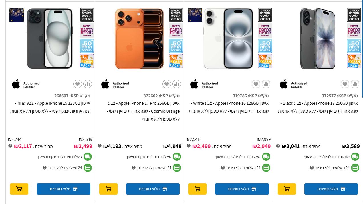 לצד מכשירי האייפון 17 פרו, ניתן למצוא שלל מכשירים נוספים בעלויות נמוכות. למשל, אייפון Apple iPhone 15 128GB (שנה אחריות יבואן רשמי וללא מטען וללא אוזניות), יעלה 2,499 שקלים. באילת, תוכלו להשיג את המכשיר בעלות של 2,117 שקלים.
