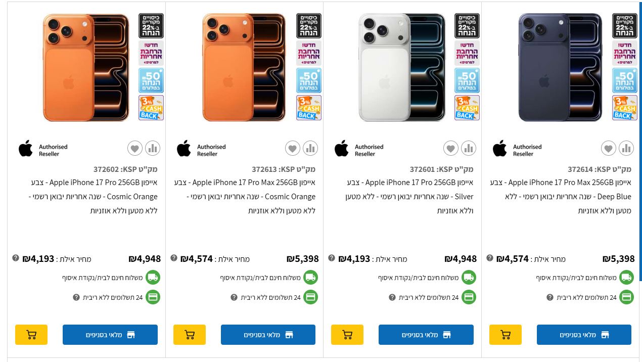 עוד נודע, כי אייפון Apple iPhone 17 Pro 256GB, שכולל שנה אחריות של היבואן הרשמי ללא מטען וללא אוזניות, יעלה 4,948 שקלים. ברכישה באחד מסניפי KSP הממוקמים באילת, ניתן להשיג את המכשיר במחיר של 4,193 שקלים.