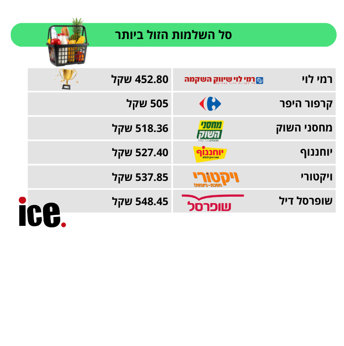 באמצעות אתר פרייסז בוצעה בדיקה רחבה של מחירי סל ההשלמות ב־12 הרשתות הגדולות בישראל. הממצאים מראים כי הסל הזול ביותר נמצא ברשת רמי לוי, בעלות של 452.80 שקל. הסל היקר ביותר, לעומת זאת, מצאנו ברשת שופרסל דיל, במחיר של 548.45 שקל.