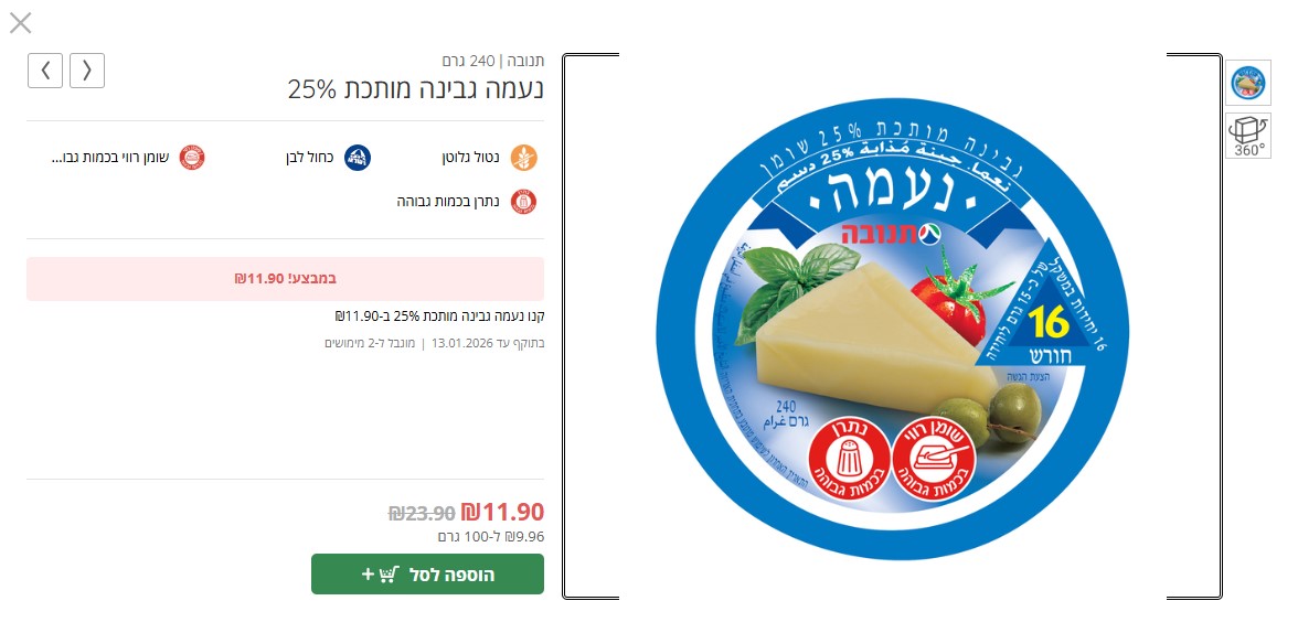בנוסף, גבינת נעמה, גבינה מותכת בעלת 25% שומן של תנובה (240 גרם) נמכרת כעת ב-11.90 שקלים במקום 23.90 שקלים. חשוב לציין, מוצרים אלו יהיו זמינים למימוש עד היום.