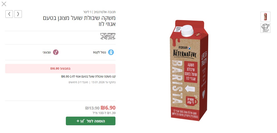 לצד זאת, רשת "מחסני השוק" הציגה מוצרי מזון נוספים שמחיריהם הופחתו באופן משמעותי במסגרת ההטבה החדשה. במחלקת תחליפי החלב, ניתן למצוא משקה שיבולת שועל בטעם אגוזי לוז של תנובה אלטרנטיב בעלות של 6.90 שקלים בלבד במקום 16.90 שקלים.