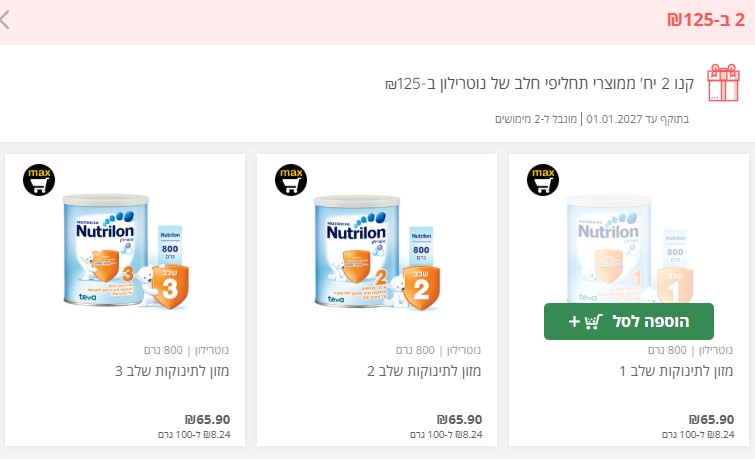 במקביל, רשת המרכולים מעדכנת על הפחתת עלויות במוצרי המזון לתינוקות. כך למשל, על שתי יחידות ממוצרי תחליפי חלב של המותג נוטרילון תשלמו 125 שקלים בלבד. במסגרת המבצע, ניתן יהיה לבחור מבין המוצרים הבאים: מזון לתינוקות שלב 1, שלב 2 או שלב 3. המבצע מוגבל לשני מימושים והוא יהיה בתוקף עד ה-1.1.27.