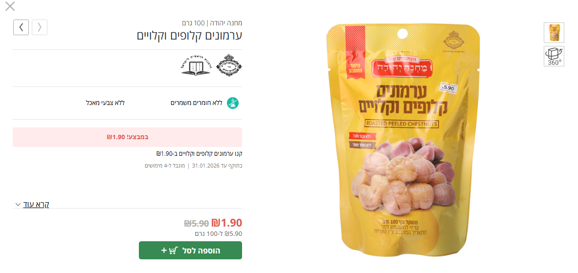 בנוסף, חבילת אגוזי קשיו מטוגנים של המותג "קליית גת" (200 גרם) זמינה לרכישה במחיר של 19.90 שקלים. ניתן לרכוש 2 יחידות ממוצרי פיצוחים, אגוזים וגרעינים של מותג המזון בעלות של 32 שקלים.