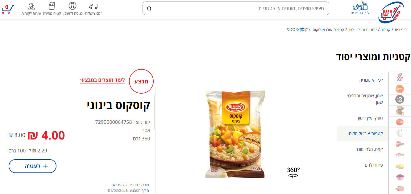 כך למשל, אריזת קוסקוס בגודל בינוני מבית אסם (350 גרם) נמכרת כעת במחיר של 4 שקלים בלבד במקום 8 שקלים. במקביל, הרשת מציעה למכירה שמן זית כתית מעולה בכבישה קרה (750 מ"ל) של המותג טעמן במחיר של 19.90 שקלים בלבד במקום 39.90 שקלים. בנוסף, 4 מנות פילה סלמון קפוא (500 גרם) של חברת מעדני הים זמינה כעת לרכישה בעלות של 24.90 שקלים במקום 49.90 שקלים.