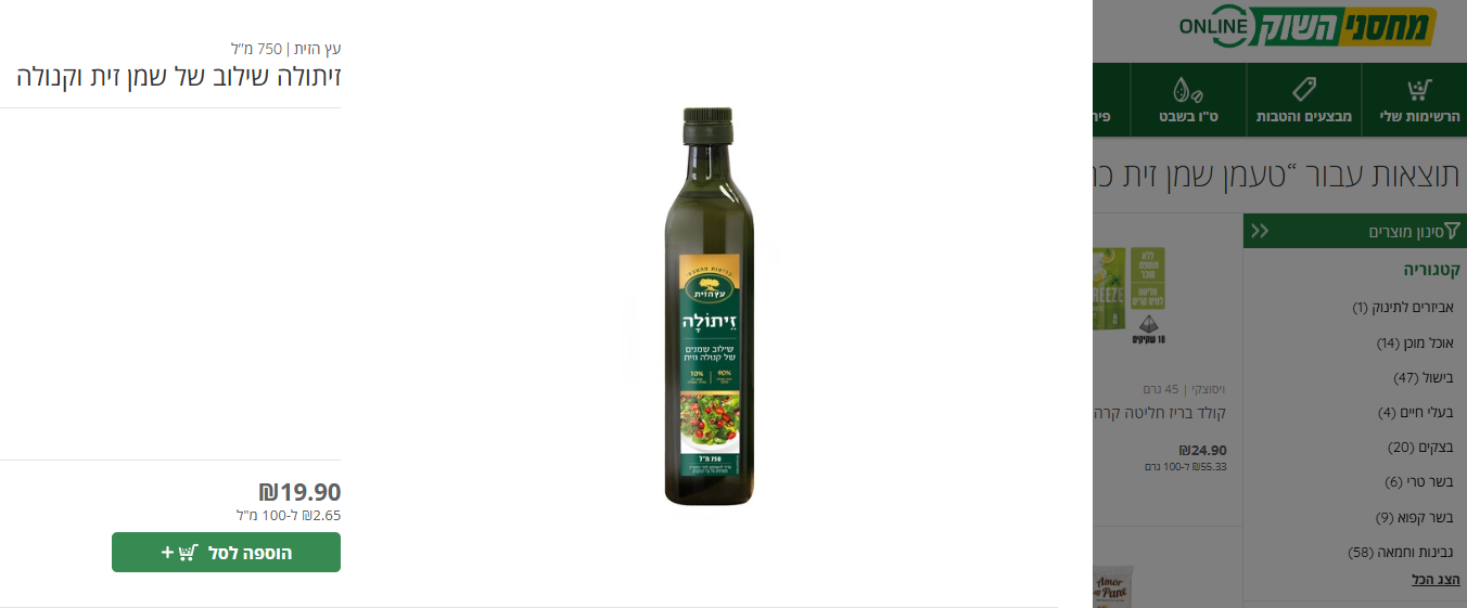 מלבד רשת "חצי חינם", שמציעה ללקוחותיה שמן זית כתית בכבישה קרה (750 מ"ל) ב-19.90 שקלים, מצאנו קמעונאית נוספת שבחרה להציג את המוצר המבוקש באותה עלות. חשוב לציין, בבדיקה שערכנו נבחנו רק בקבוקי שמן זית בנפח 750 מ"ל. רשת "מחסני השוק" מציעה את המוצר של "זיתולה" (750 מ"ל) - בקבוק שמכיל שילוב שמנים של קנולה וזית.