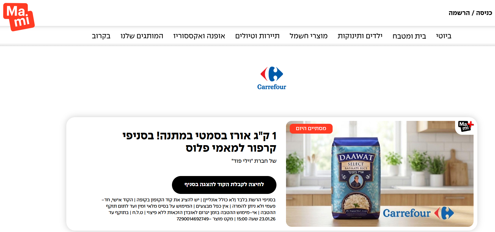 לקוחות מועדון הצרכנות שהצטרפו למסלול +Mami יוכלו ליהנות משוברים, מתנות והנחות בלעדיות והגרלות שונות. התשלום על השירות המדובר הינו 49 שקלים לחודש. בסרטון שפרסמה ברשת החברתית, מעיין אדם סיפרה על המבצע שיסתיים היום עד השעה 15:00, במסגרתו חברי המסלול +Mami רשאים להגיע לאחד מסניפי רשת "קרפור" ולקבל במתנה אורז בסמטי במתנה של המותג "וילי פוד".