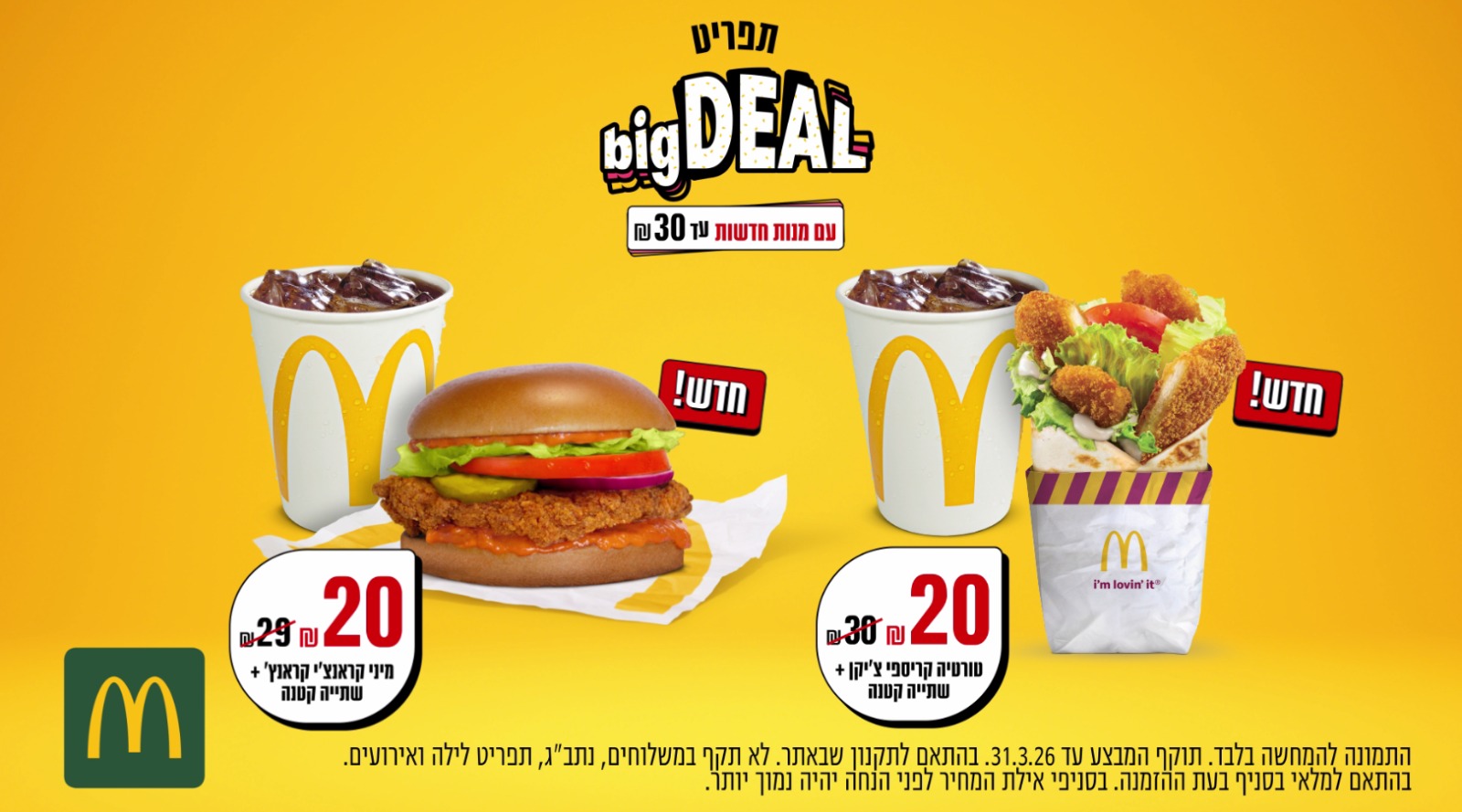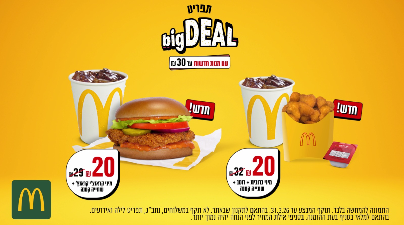 קורין קטנר, סמנכ"לית שיווק, מקדונלד'ס ישראל: "אנחנו שמחים להשיק את תפריט 'Big Deal' המחודש, שמציע מגוון רחב של מוצרים במחיר משתלם מתוך מחשבה על העדפות הצרכנים בישראל. לצד זאת, ביצענו עדכון מחירים מתון, במטרה לשמור על האיזון בין הסטנדרטים הגבוהים ואיכות המזון הבלתי מתפשרת שלנו לבין המציאות הכלכלית הנוכחית. מקדונלד'ס ישראל ממשיכה להציע את סל המוצרים האיכותי ביותר, במחיר הנגיש ביותר בשוק".