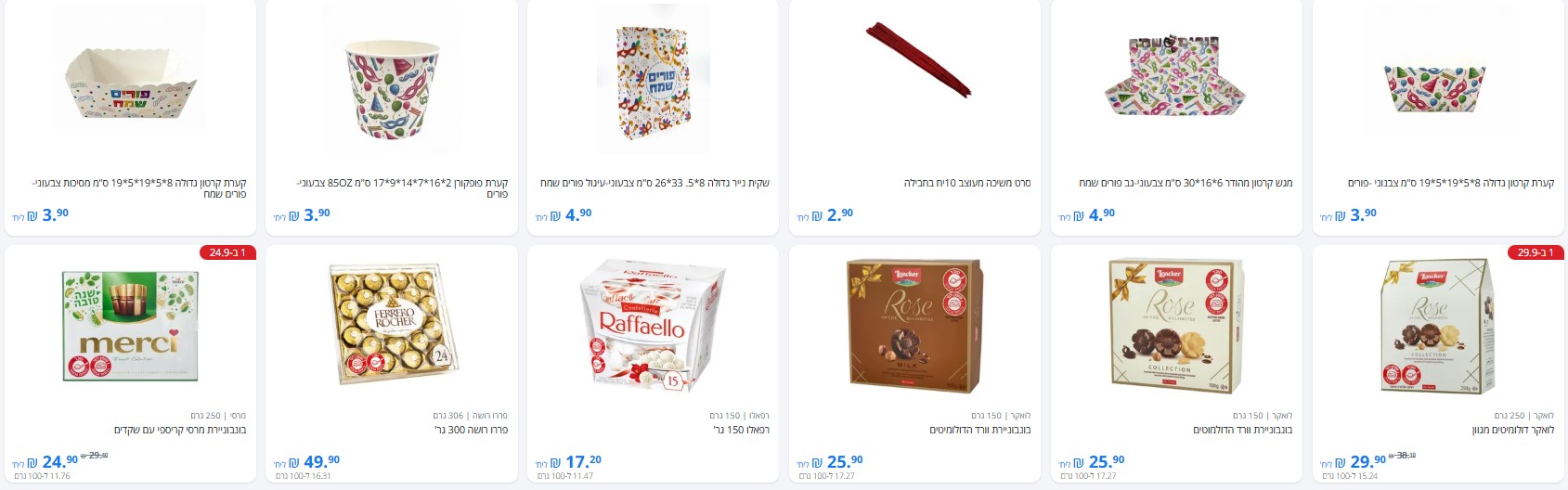 לכבוד חג הפורים, רשת השיווק מציעה עשרות מוצרים בעלויות נמוכות במיוחד, החל ממארזי קרטון מעוצבים, כלים חד פעמיים וכלה בחטיפים וממתקים. עבור יצירת משלוח מנות, החברה מציעה קערות קרטון גדולות בעלות של 3.90 שקלים.