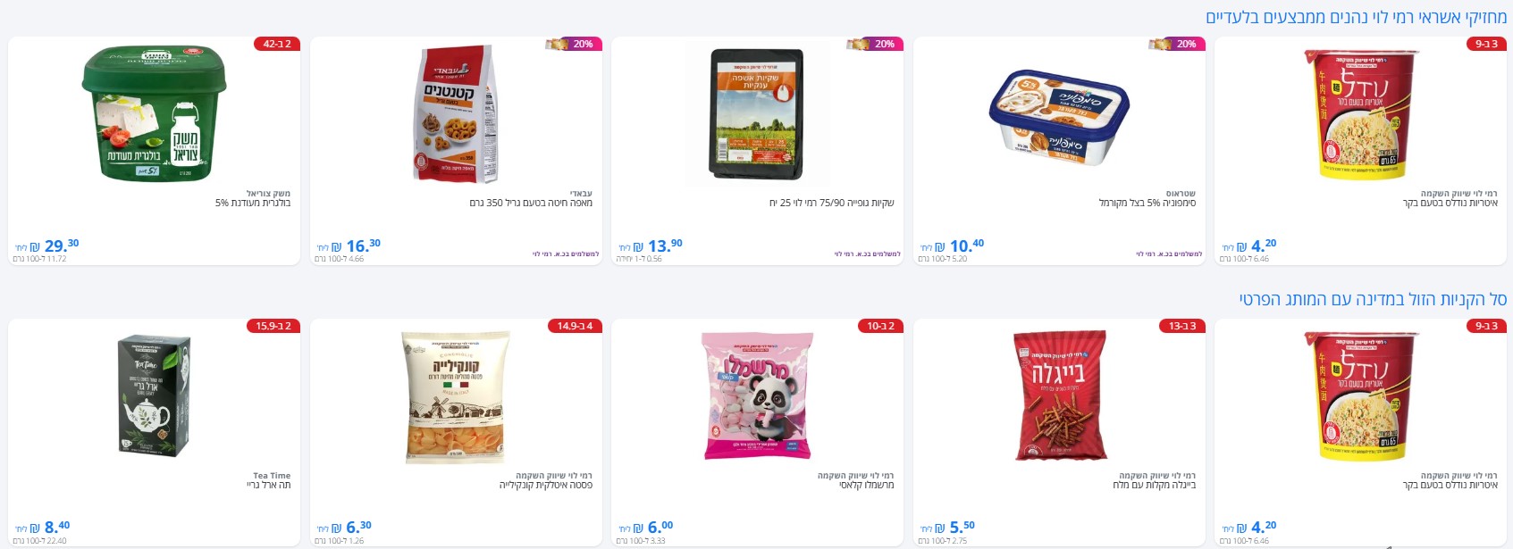 כך למשל, חבילת אטריות נודלס בטעם בקר של המותג הפרטי נמכרת כעת ב-4.20 שקלים. גבינת סימפוניה 5% בצל מקורמל של שטראוס תעלה 10.40 שקלים למחזיקי כרטיס האשראי. בנוסף, חבילת עבאדי (350 גרם) בטעם גריל נמכרת ב-16.30 שקלים וגבינת בולגרית מעודנת 5% של משק צוריאל זמינה לרכישה במחיר של 29.30 שקלים.