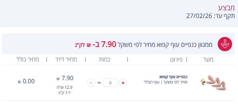 לצד זאת, רשת השיווק מציגה ירידה במחירי מוצרי מזון נוספים במחלקות הבשר, העוף והדגים. כך למשל, עלות אריזת כבד עוף טרי מסתכמת ב-19.90 שקלים לק"ג. על פי האתר הרשמי של שופרסל, מבצע זה תקף עד ה-13 בפברואר.