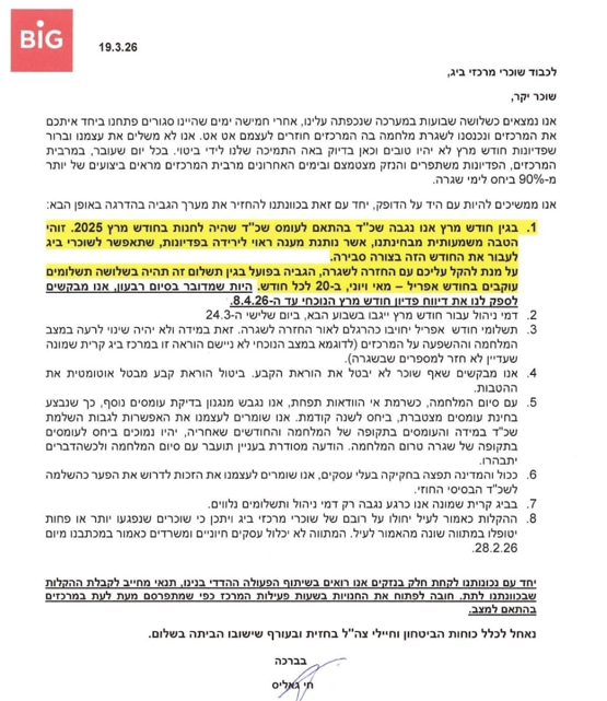 במכתב שנשלח לשוכרי מרכזי ביג, התווה חי גאליס את הצעדים המשמעותיים: "בגין חודש מרץ אנו נגבה שכ"ד בהתאם לעומס שכ"ד שהיה לחנות בחודש מרץ 2025. זוהי הטבה משמעותית מבחינתנו, אשר נותנת מענה ראוי לירידה בפדיונות, שתאפשר לשוכרי ביג לעבור את החודש הזה בצורה סבירה".