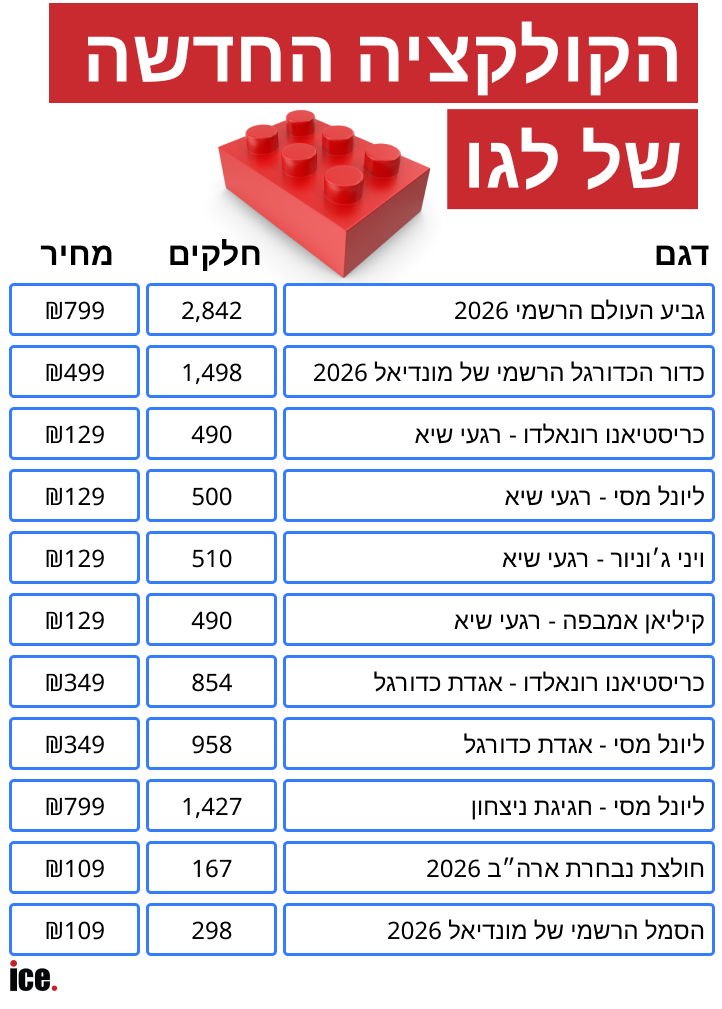 הקולקציה נחשפה לקראת מונדיאל 2026 שיחל ביוני הקרוב, וכוללת דמויות לגו של הכוכבים, דגם של גביע העולם, סטים בהשראת רגעים אייקונים מהקריירה שלהם. כעת, לגו שחררה את הקולקציה הנחשקת, ומחירי הפריטים המבוקשים נחשפו לראשונה - זו טבלת המוצרים, מספר החלקים ומחיר הפריט: