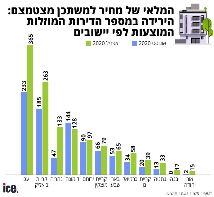 אולם המספרים הגדולים באמת נמצאים בפריפריה הצפונית: מלאי הדירות שהוצעו למכירה ללא הגרלה בעכו הגיע ל-365 באפריל, וכעת מספרן עומד על 233; בנהריה מלאי הדירות ירד מ-133 ל-47 בלבד, ואילו בקרית ביאליק המלאי ירד מ-263 לפני ארבעה חודשים ל-183 היום.