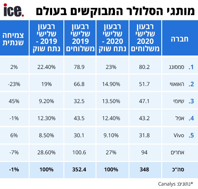 348 מיליון מכשירי סלולר נשלחו ברחבי העולם ברבעון השלישי של 2020, כך עולה מהדו"ח העדכני של חברת Canalys, שבדקה את היקף המשלוחים של מכשירים ניידים. סמסונג חזרה למקום הראשון במסירת טלפונים ניידים ברבעון השלישי של 2020, עם צמיחה של 2% לעומת הרבעון המקביל אשתקד ונתח שוק של 23% ובסך הכל 80.2 מיליון מסירות של מכשירים. כך עולה מנתוני Canalys.