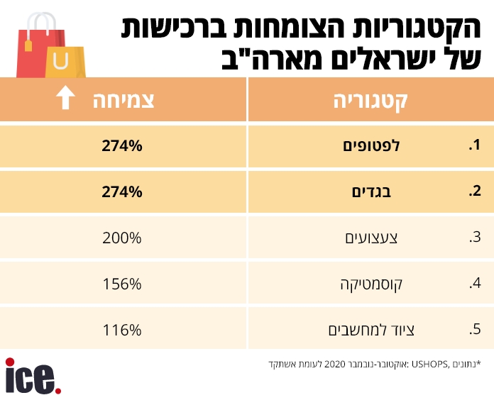 מנתוני חברת USHOPS המתמחה בייבוא אישי מארה"ב, עולה כי חל זינוק חד ברכישות של ישראלים ישירות מארה"ב. הקטגוריות הצומחות ביותר בהיקף הרכישות של ישראלים מארה"ב הם: בגדים (274%), לפטופים (274%), צעצועים (200%), קוסמטיקה (156%), ציוד נלווה למחשבים (116%). הנתונים מסתמכים על הזמנות שביצעו הישראלים בחודשים אוקטובר נובמבר 2020 בהשוואה לחודשים המקבילים אשתקד.