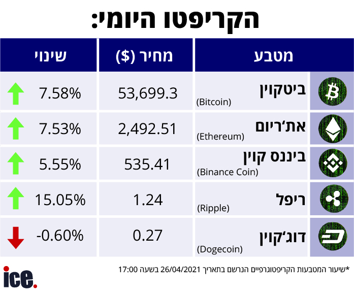 הביננס קוין התחזק ב-5.55% וטיפס לשער של 535.41 דולר, אבל העלייה הגדולה ביותר שייכת לריפל שעלה בלא פחות מ-15.05% לשער של 1.24 דולר, הדוג'קוין ירד ב-0.60% ל-0.27 דולר בלבד.