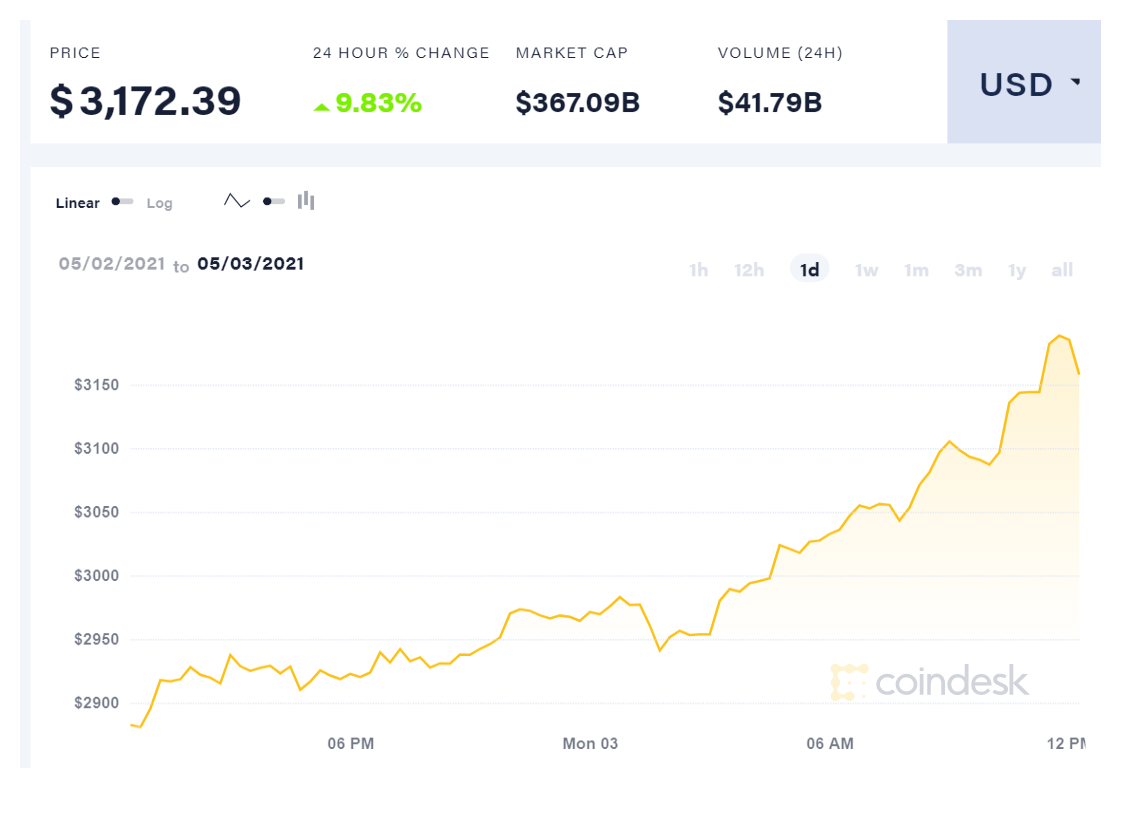 אחרי שכבר אמש חלה עלייה קלה בערכו, במהלך שעות הבוקר הוא טיפס עוד והצליח לחצות את סף 3,000 הדולר. כעת הוא מסתכל אל עבר האתגר הבא - 4,000 דולר, דבר שעשוי לקרות במהלך השבוע הקרוב אם הקצב יישמר כמו בשבוע החולף. בשעות אלו נסחר המטבע הדיגיטלי סביב ה-3,138 דולר.