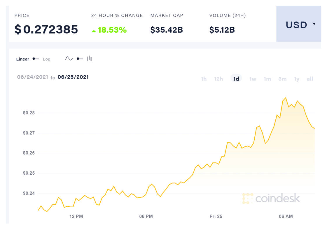במהלך שעות הלילה, טיפס ערכו של הדוג'קוין ב-18.53% ולפרקים אפילו גבוה מכך והתייצב נכון לשעה 08:40 על 0.272 דולר ליחידה, כאשר שווי השוק שלו עלה משמעותית ל-35.42 מיליארד דולר.