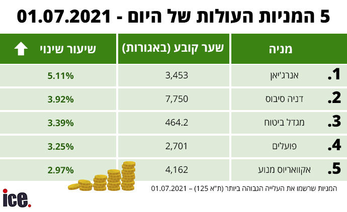 את המניות העולות מוליכה אנרג'יאן שטיפסה ב-5.11% לשער חדש של 3,453 אגורות בסך הכל, דניה סיבוס במקום השני לאחר שעלתה ב-3.92% לרמה של 7,750 אג', מגדל ביטוח תופסת את המקום השלישי בזכות שינוי חיובי של 3.39% ושער של 464.2 אג', פועלים במקום הרביעי עם עלייה של 3.25% ושער של 2,701 אג', סוגרת את החמישייה אקוואריוס מנוע שרשמה זינוק של 2.97% עם שער חדש של 4,162 אג'.