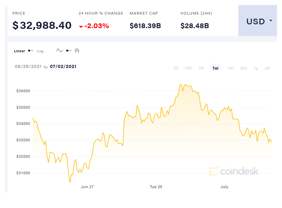 הביטקוין, המטבע הדיגיטלי הבכיר, חווה ירידה של 2.03% בדרך לשער חדש של 32,988.40 דולר בלבד ליחידה, כאשר שווי השוק שלו צנח ל-618.39 מיליארד דולר בלבד, בכך הוא שוב מתקרב לרדת מחוץ לרף 30 אלף הדולר.