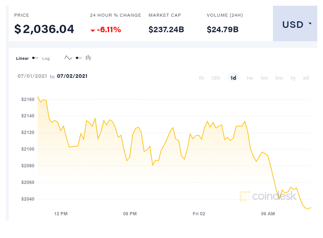 האתריום לעומת זאת חווה פגיעה הרבה יותר קשה, כאשר איבד מערכו 6.11% בסך הכל והתרסק ל-2,036.04 דולר בלבד, זאת בשונה למגמה מלפני יומיים. שווי השוק שלו פחת לרמה של 237.24 מיליארד דולר בסך הכל.