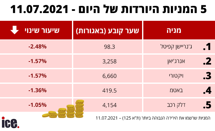 מי שמוליכה את המניות היורדות של היום היא ג'נריישן קפיטל שירדה ב-2.48% ל-98.3 אג', אנרג'יאן במקום השני עם ירידה של 1.57% בדרך ל-3,258 אג', ויקטורי שלישית עם ירידה דומה של 1.57% ל-6,660 אג' ובאטמ במקום הרביעי בשל ירידה של 1.36% לשער של 419.5 אג'. סוגרת את החמישייה דלק רכב שאיבדה 1.05% ל-4,154 אג'.