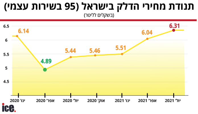 בדיוק לפני שנה, ביולי 2020, המחיר עוד היה 5.44 שקל לליטר בנזין 95 אוקטן נטול עופרת לצרכן בתחנה בשירות עצמי (כולל מע"מ), כאשר המחיר המרבי לליטר בנזין 95 אוקטן נטול עופרת לצרכן בתחנה בשירות עצמי באילת (ללא מע"מ) לא יעלה על 4.65 שקל לליטר.