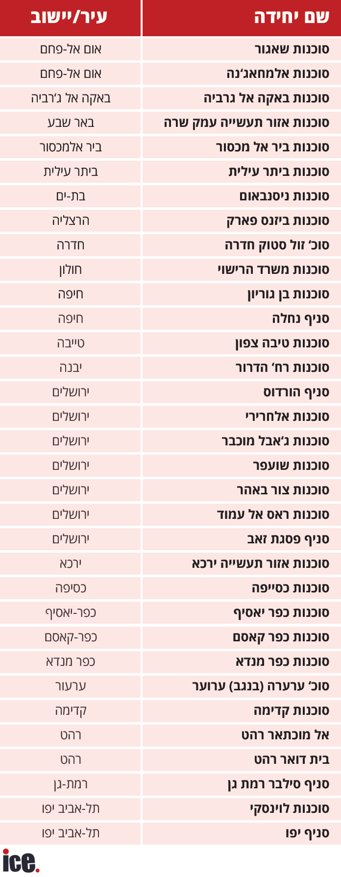 מבין 33 היחידות שבהן התגלו זמני המתנה ארוכים במיוחד ניתן למצוא את סוכנות לוינסקי וסניף יפו בתל אביב-יפו, סוכנות אזור התעשייה עמק שרה בבאר שבע, סוכנות אלחרירי וסניף הורדוס בירושלים, סניף סילבר ברמת גן וסוכנות שאגור באום אל פאחם (הרשימה המלאה נמצאת בתחתית ההודעה).