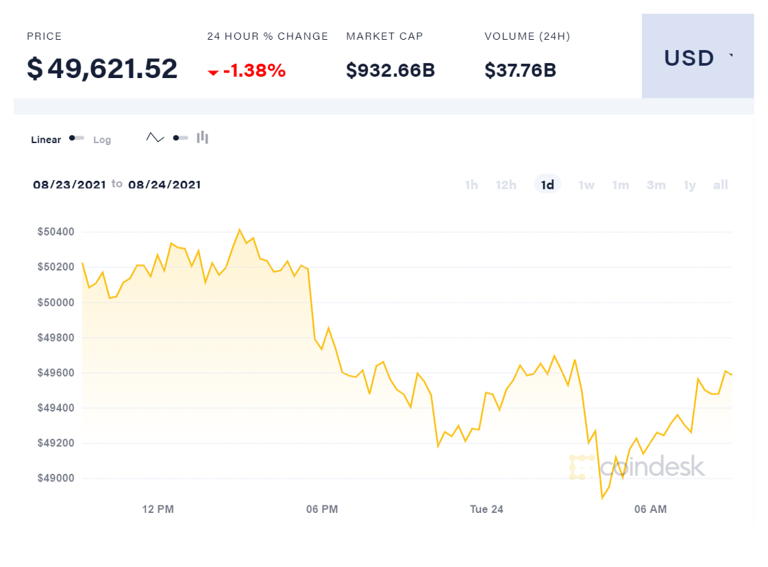 אחרי שחצה אמש את רף 50 אלף דולר, הביטקוין חזר הבוקר (שלישי) ל-49,621.52 דולר בסך הכל, בשל ירידה של 1.38% בסך הכל, מה שגם הקטין את שווי השוק של המטבע הדיגיטלי הבכיר ל-932.66 מיליארד דולר בסך הכל.