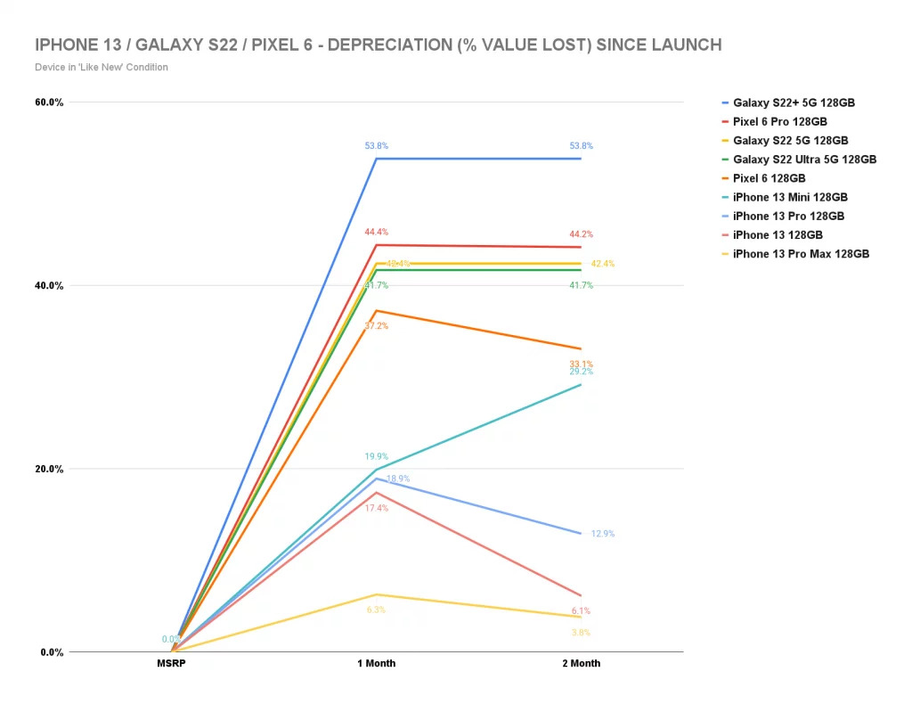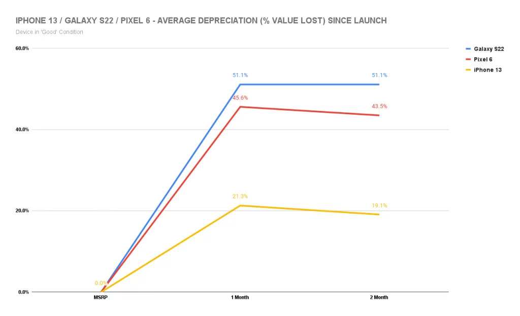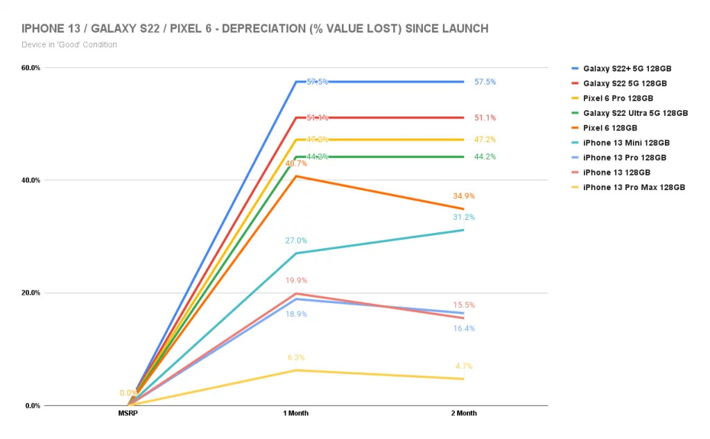 מכשירי סמסונג מאבדים את ערכם במהירות כמעט מטרידה לאחר ההשקה, אפילו כאשר הם במצב "כמו חדשים": מכשירי סדרת גלקסי S22 הוערכו חודש לאחר השקתם במחיר ממוצע של כמעט 47% פחות ממחיר ההשקה, וגם בחודש שלאחר מכן נשארו באותו מחיר. הדגם הגרוע ביותר היה גלקסי S22+, שאיבד 53.8%, לעומת הדגם הרגיל שאיבד 42.4% ודגם האולטרה שאיבד 41.7%; זאת לעומת מכשירי פיקסל של גוגל, שאיבדו בממוצע 43% בחודש הראשון ובחודש השני אף השיבו לעצמם מעט מערכם, כאשר הוערכו ב-41.5% מתחת למחיר ההשקה. הדגם הגרוע ביותר של החברה היה פיקסל 6 פרו, שאיבד 44.4% בחודש הראשון ובשני נמכר במחיר של 44.2% מתחת למחירון ההשקה;