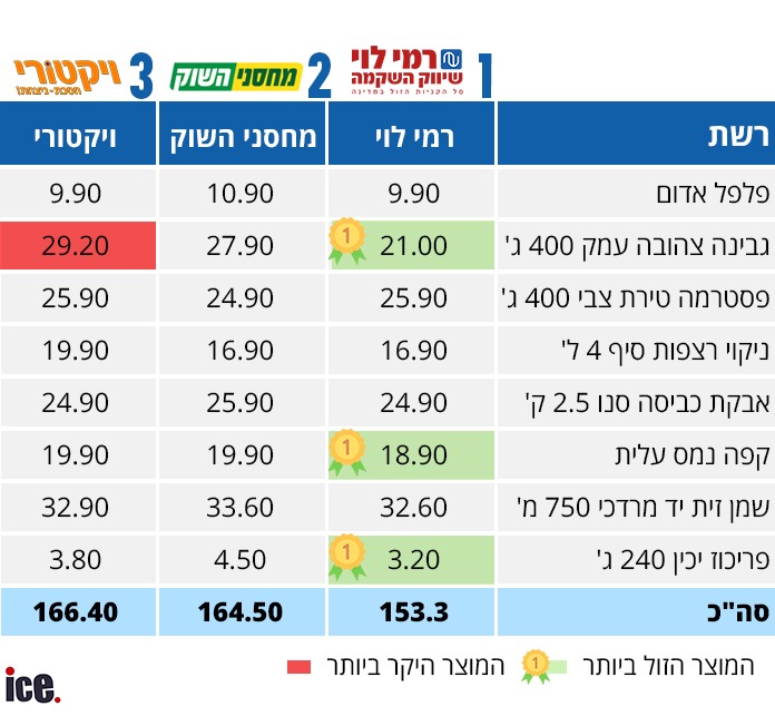 בדיקת Ice מצאה כי הרשת המשתלמת ביותר בסל הקניות השבועי היא רשת "רמי לוי" שעבור מוצרים אלה תבקש מכם 153.30 שקלים. במקום השני (והמפתיע) סיימה "מחסני השוק" עם סל על סך 164.50 שקלים, מייד אחריה ובפער זעום סיימה רשת "ויקטורי" עם מחיר של 166.40 שקלים.