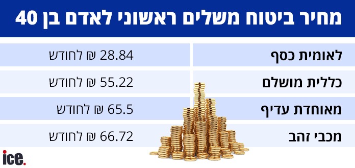 האופציה הזולה ביותר בפער ניכר היא "לאומית כסף", שם אדם בן 40 נופל בחתך גילאים שבין 39.5 -44.5, בו עלות השירות הינה 28.84 ש"ח לחודש. במקום השני נמצא הביטוח "כללית מושלם", עליו מבוטחים בין גילאי 40-49 משלמים 55.22 ש"ח לחודש. במקום השלישי נמצא "מאוחדת עדיף" בו אדם בין גילאי 30-55 ישלם 65.5 ש"ח עבור השירות. את הרשימה סוגר "מכבי זהב", אשר העלות שלו לאנשים בגילאי 30-45 הינה 66.72 ש"ח בחודש.